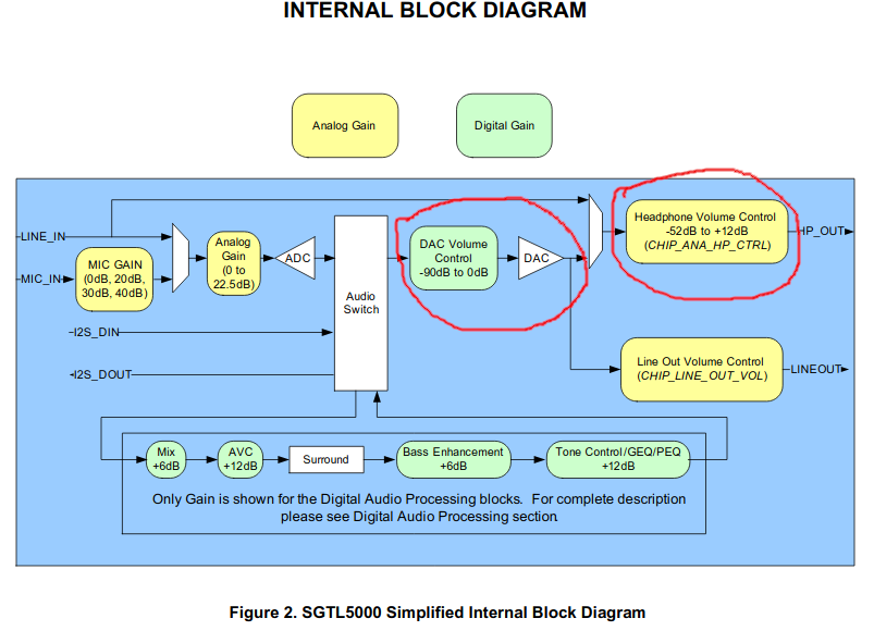 The SGTL5000 has two gain stages like show in the picture below. A digital DAC gain stage and an analog headphone amp stage.