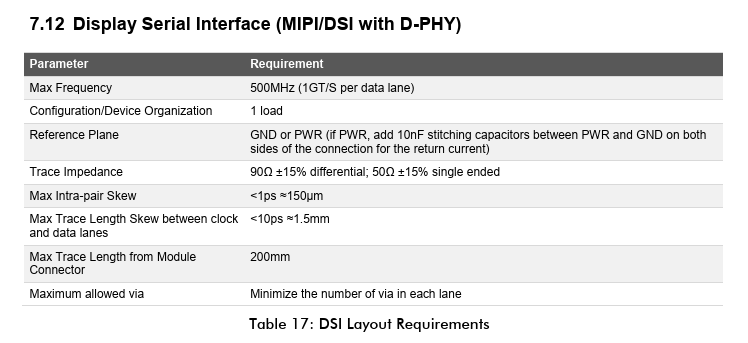 I am trying to include a MIPI DSI display onto my Colibri iMX8qxp board (a viola, although this post requires none of the viola peripherals) and am having some issues. I suspect it is a problem with a custom interface board I have placed between my SOM and the display. I had a separate engineer do the layout on this interface board, and he used a two layer board without differential routing, length matching, 50-Ohm traces, or any ground planes. I am highly suspicious of this interface board, as the colibri datasheet claims that the maximum skew only allows for a delay caused by 1.5 mm of mismatch. That being said, I want to rule out all other possibilities before moving forward with another board spin. I will outline my bring-up process here (additionally, to help anyone who is starting down this path, as there is quite a lot of information to sort through) and would appreciate pointing out where any errors may lay.