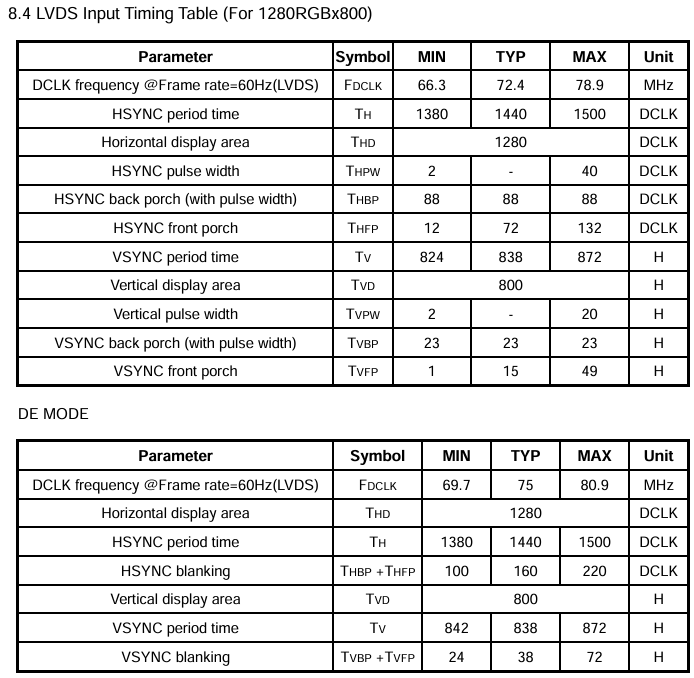 I am using an LVDS dsplay 10’’ with resoluztion 1280*800. I would like to request support in configuring the display timing parameters in the dts device tree overlay. I have all the timing values from the panel’s datasheet, but I don’t understand how to set alla timing parameters. This is the table: