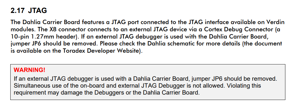 Hi @katsu , I’m checking more details on the JTAG and the connection with the i.MX8MM with the Dahlia. Essentially is the same than NXP EVK once you remove the JP6: Direct connection to the SOC.