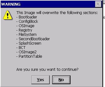 We are using CE6. I first did the update using the nvflash.exe tool from a PC using the most recent ce6.cfg, the 2.0 eboot.nb0 from your site and our own image nk.nb0. This programs ok without errors. The device boots up as expected.