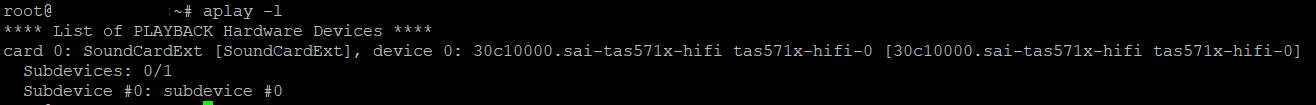 When booting the device it does not list any device in the ALSA device list, and it does not report “tas571x-hifi <-> 30c10000.sai mapping ok” which is reported in the older Linux version.