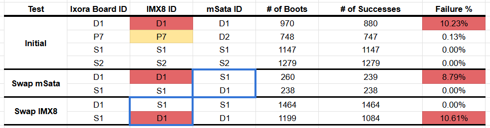It is very clear that the failure follows the IMX8 SOM not the carrier board or the SSD. As you mentioned before, this suggests a hardware issue and we have one clear failure case (D1 above) and another potential case (P7).