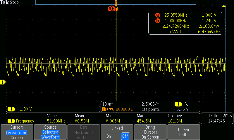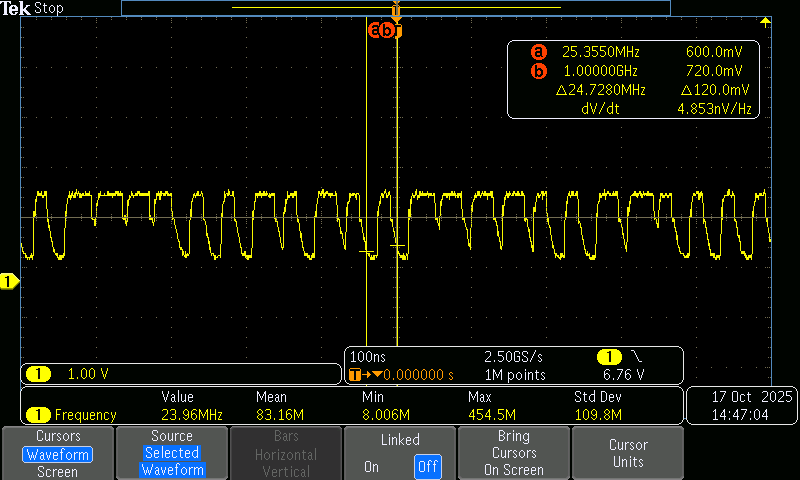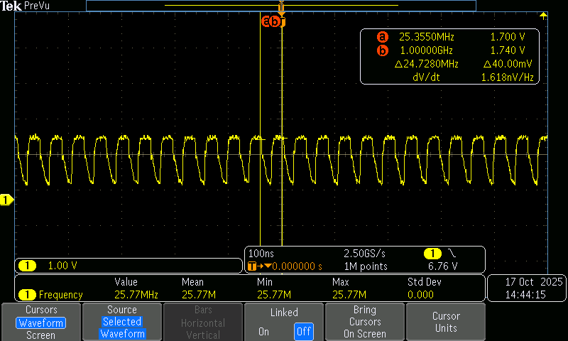 - I’ve confirmed the patch is applied correctly. I’ve scoped the LVDS_CLK lines and can see that it is indeed operating at 25MHz in both cases.