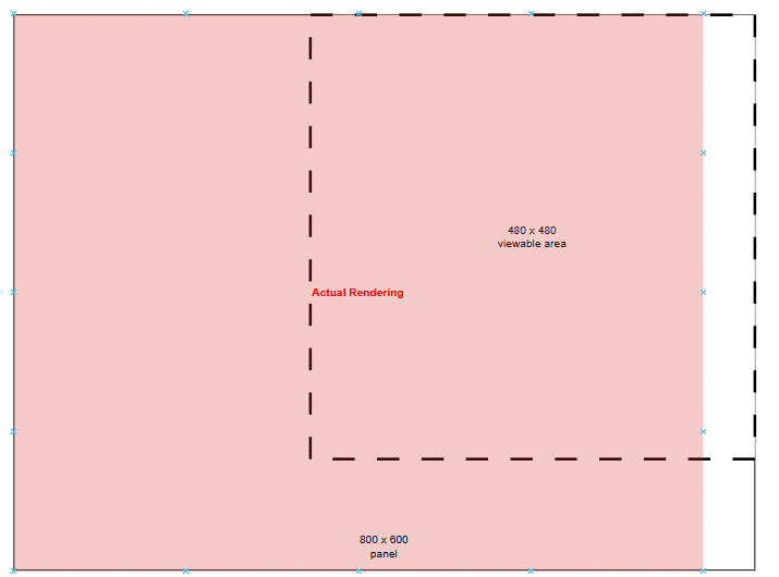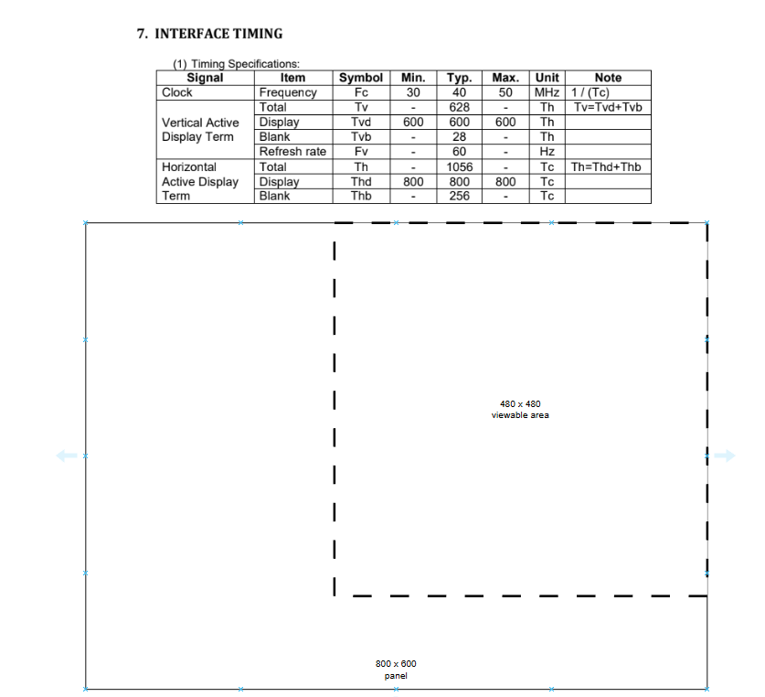 The key to your subsection approach is calculating the correct porch values to center or position your 480x480 active area within the full 800x600 timing structure that your panel expects.