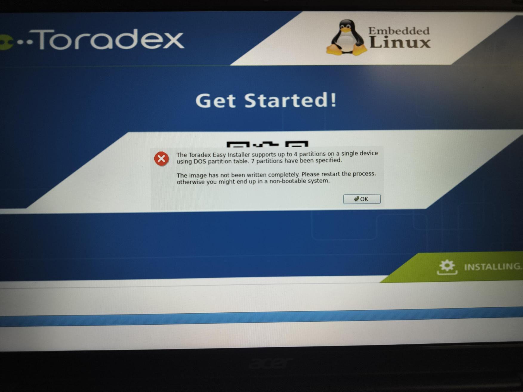 After building, copy the generated TEZI tar file to your SD card and use Toradex Easy Installer to apply the custom partition layout to your device.