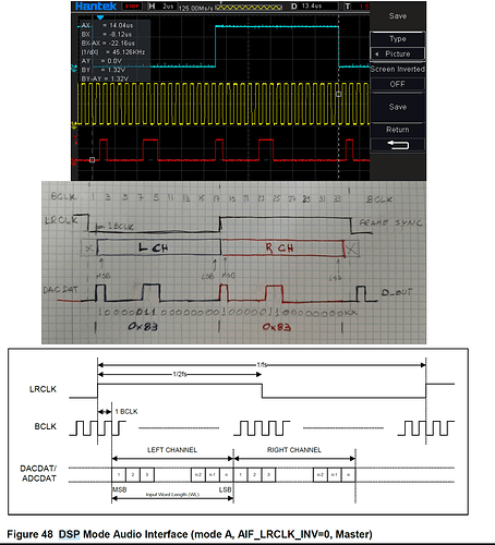 We have been analyzing the configurations of the audio codec and the i2s of the imx8mm that you make. From this analysis it can be deduced that both devices have been configured to work in I2S Justified Audio Interface mode (see figure 47 of the codec manual) but when measuring the I2S signals with the oscilloscope it seems that the imx8mm is transmitting in DSP Mode Audio Interface mode A format ( see figure 48 of the codec manual).