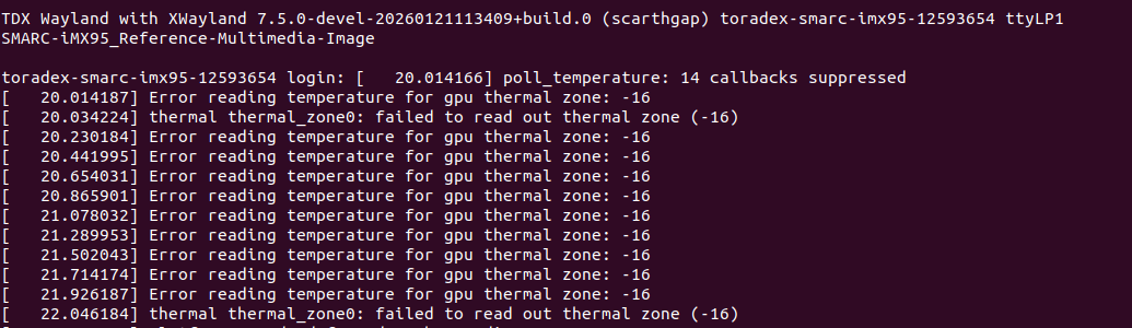 Based on the error you’re seeing, this appears to be a thermal zone readout issue with the GPU thermal zone on your iMX95 SoM. The error code -16 typically indicates a device or resource busy error in Linux.