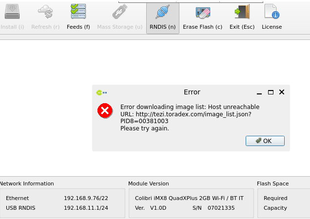 I currently using Toradex Easy Installer through USB OTG, but Im not able to see the list of images from the toradex server. I can see the USB RNDIS and Ethernet connection (IP address).
