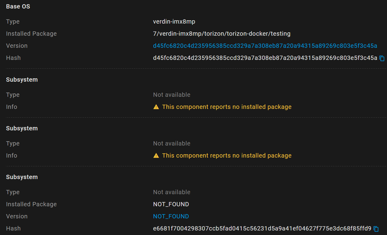 From a general standpoint I’m not sure what else to recommend. Either you can guarantee that the subsystems report accurate info back to Torizon Cloud. Which means designing your subsystems in a way that something valid is always reported back in every scenario your system might be in. Or, if this can’t be guaranteed. You report back known dummy information that matches with dummy packages. That way at least some helpful information is shown in the Torizon Cloud UI.