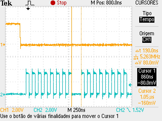 Because of this characteristic, I’m losing the first bit of the byte, oscilloscope second channel signal, since its time is lower than the necessary time request by the chip to change the SO output.